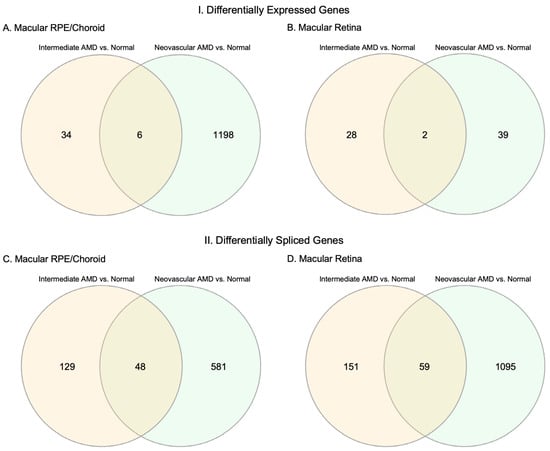 Overlap of differentially expressed genes (DEGs) and differentially spliced genes (DSGs) between intermediate AMD (iAMD) vs. normal and neovascular AMD (NEO) vs. normal. (A–D) Each circle represents the number of significant DEGs or DSGs in macular RPE (retinal pigment epithelium)/choroid and macular retina. The overlap between these two circles shows the number of overlapping genes that were regulated in the same direction between each comparison. Abbreviations: AMD, age-related macular degeneration, RPE, retinal pigment epithelium.