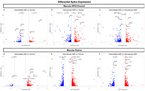 Volcano plots of differentially spliced genes across disease states. (A–F) Each dot represents one of the 26,650 genes expressed. Blue and red represent significant genes, with red representing upregulation and blue representing downregulation in each disease comparison. Grey dots represent genes that did not meet the significance threshold of padj < 0.05 and a fold change ≥ |1.5|. The ten most significant genes in each disease comparison are labelled. Abbreviations: AMD, age-related macular degeneration, RPE, retinal pigment epithelium.