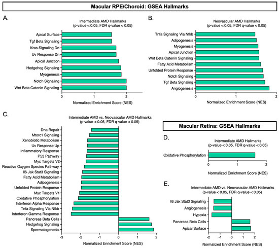 Gene set enrichment analysis (GSEA) using our normalized expression dataset. Thresholds were set based on the nominal p-value < 0.05 and FDR q-value ≤ 0.05 generated by the GSEA software, v.4.3.2. (A–C) show the significant hallmarks (p-value < 0.05, FDR q-value ≤ 0.05) identified in the macular RPE/choroid across disease state. (D,E) show the significant hallmarks (p-value < 0.05, FDR q-value ≤ 0.05) identified in the macular retina across disease state. Please note: no hallmark was identified to be significantly upregulated in neovascular AMD for the macular retina. Abbreviations: GSEA, gene set enrichment analysis, AMD, age-related macular degeneration, RPE, retinal pigment epithelium.