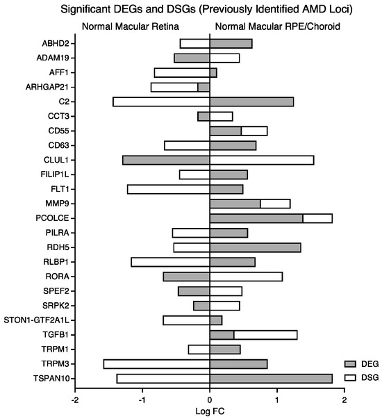 Genes demonstrated to be associated with AMD risk in prior candidate or GWAS studies were examined [7,29,30,52,53,54,55,56,57,58,59] in our normal tissue, comparing the macular RPE/choroid to the macular retina, to characterize the transcriptomic landscape at a baseline state in the tissue affected by disease. A total of 94 DEGs out of 115 of the previously identified AMD loci were found to have statistically significant differential expression in our data set (Table 2). Sixty-seven DEGs (ABCA1, ABHD2, ACAA2, ADAMTS9-AS1, ADAMTS9-AS2, C2, C3, C4A, C5, C9, CD46, CD55, CD63, CETP, CFB, CFH, CFHR3, CFI, CNN2, COL5A1, COL8A1, EXOC3L2, FILIP1L, FLT1, HLA-DQB1, IER3, IGFBP7, IL6, ITGA7, LBP, LIPC, LRP6, ME3, MMP19, MMP9, MYO1E, NPLOC4, OCA2, PCOLCE, PDGFB, PILRA, PKP2, PLA2G4A, RAD51B, RASIP1, RDH5, RGS13, RLBP1, ROBO1, RRAS, SERPINA1, SKIV2L, SLC16A8, SMAD3, STON1, STON1-GTF2A1L, TGFB1, TGFBR1, TIMP3, TNF, TNFRSF10A, TRPM1, TRPM3, TSPAN10, TYR, UNC93B1, and VDR) were shown to have significantly higher expression (padj < 0.05) in the macular RPE/choroid (Table 2). Less than half, or 27 DEGs (ABCA7, ADAM19, AFF1, ARHGAP21, B3GALTL, C10orf88, CCT3, CDH7; CDH9; CLUL1; CSK; CYP24A1; DDR1; HERC2; HTRA1; KMT2E; NLRP2, PELI3, RORα; RORβ, RP1L1, SPEF2, SRPK2, SYN3, TMEM97, VTN, and ZNF385B), were observed with significantly higher expression in the normal macular retina compared to the normal macular RPE/choroid (Table 2). In contrast, about half (or twelve) DSGs (ADAM19, CCT3, CD55, CLUL1, GTF2A1L, MMP9, PCOLCE, RORα; SPEF2, SRPK2, TGFB1, and ZBTB38) were shown to have significantly higher expression (padj < 0.05) in the macular RPE/choroid (Table 3). Fourteen DSGs (ABHD2, AFF1, ARHGAP21, C2, CD63, FILIP1L, FLT1, PILRA, RDH5, RLBP1, STON1-GTF2A1L, TRPM1, TRPM3, and TSPAN10) were observed with significantly higher expression in the normal macular retina compared to the normal macular RPE/choroid (Table 3). Significant DEGs/DSGs in normal macular RPE/choroid vs. normal macular retina illustrated the direction of expression in each dataset (Figure 6).