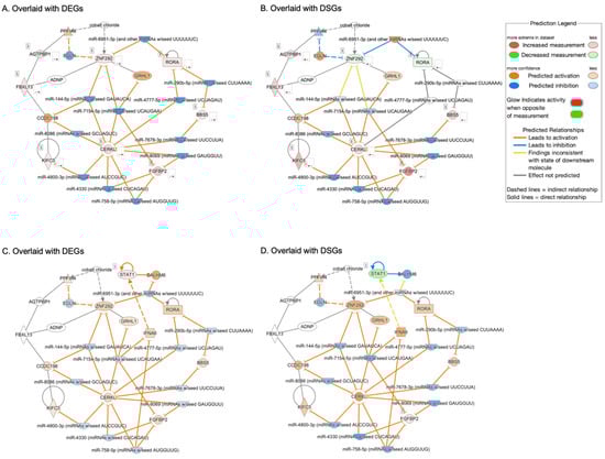 When interrogating the seven validated DEG/DSGs (AGTPBP1, BBS5, CERKL, FGFBP2, KIFC3, RORα, and ZNF292) from the NEO vs. normal comparison in Ingenuity Pathway Analysis (IPA), a network was generated of upstream regulators and downstream targets forming possible interconnections between these DEG/DSGs (Figure 7A,B). Eleven miRNAs were found to form relationships with these genes. Next, STAT1, from our iAMD vs. normal comparison, was added to the network to visualize how it may interact with our seven validated genes (Figure 7C,D). All networks were overlaid with our expression data corresponding to the respective disease state (iAMD or NEO) for DEGs and DSGs (Figure 7A–D).