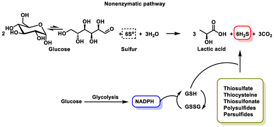 Non-enzymatic H2S production occurs via glucose, glutathione, organic and inorganic polysulfides and elemental sulfur. The reduction of elemental sulfur using NADPH or the oxidation of glucose in the phosphogluconate pathway also produces H2S in a non-enzymatic form [41].