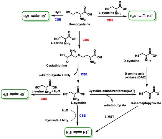 The biosynthesis of H2S mammalian cells primarily involves cystathionine β-synthase (CBS), cystathionine-γ-lyase (CSE) and 3-mercaptopyruvate sulfurtransferase (3MST).