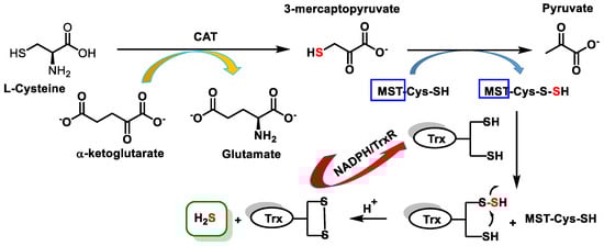 The enzyme known as cysteine aminotransferase (CAT) facilitates the transamination process of cysteine and α-ketoglutarate, leading to the production of mercaptopyruvate and glutamate, respectively. Subsequently, another enzyme called mercaptopyruvate sulfurtransferase (MST) catalyzes the transfer of sulfur from 3-MP to a specific active cysteine site. This transfer leads to the formation of pyruvate and a persulfide compound bound to MST. The persulfide bound to MST then reacts with thioredoxin and eventually produces H2S [53].