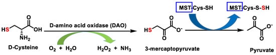 A synthesis pathway has been described from D-cysteine, which by action of the enzyme D-amino acid oxidase (DAO) produces 3-mercaptopyruvate, which serves as a substrate for 3MST [54] (Figure 7).