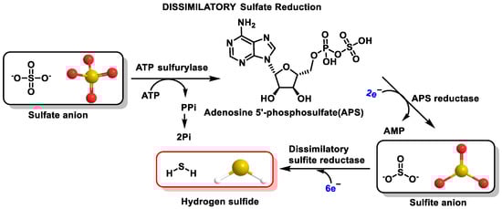Sulfate reduction, depending on the micro-organism, can take place in two ways: assimilatory and dissimilatory [60,61]. In dissimilatory sulfate reduction, H2S is produced, and in the assimilatory form, the terminal product is cysteine. The above pathways show clear differences, which are mainly characterized by the role of dissimilatory sulfate in energy production and the function of sulfate as an electron acceptor. In the process of assimilatory sulfate reduction, sulfate serves as a substrate for the production of amino acids.