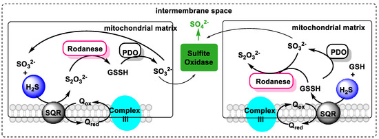 Four enzymes are involved in the oxidation pathway: (i) One is sulfur quinone oxidoreductase (SQR), which catalyzes the transfer of two electrons from sulfur to oxidized coenzyme Q. The sulfur is oxidized and transferred to an acceptor molecule (GSH or sulfite). (ii) Others are sulfur transferase (rhodanase) and (iii) oxidases such as persulfide dioxygenase (PDO) and sulfite oxidase (Figure 11). Sulfate and thiosulfate are the main products of the mammalian mitochondrial sulfide oxidation pathway and are safer than sulfide [14].