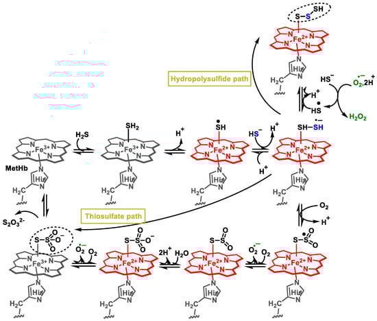 In methemoglobin, iron is present as Fe(III), which can react reversibly with H2S to form an intermediate MetHb-Fe(III)-SH2. H2S can dissociate and subsequently replenish iron heme through a reversible mechanism. Alternatively, it has the potential to convert ferrous heme into its ferrous counterpart. This redox process would be favored by the loss of a proton from H2S bound to the heme. Methehemoglobin binds to H2S, and the end result is oxidation to a mixture of thiosulfate and hydropolysulfides (Figure 12).