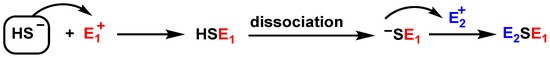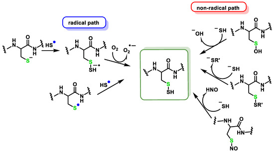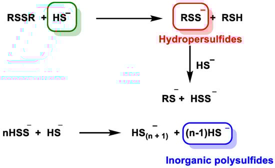 - Cuevasanta, E.; Lange, M.; Bonanata, J.; Coitiño, E.L.; Ferrer-Sueta, G.; Filipovic, M.R.; Alvarez, B. Reaction of Hydrogen Sulfide with Disulfide and Sulfenic Acid to Form the Strongly Nucleophilic Persulfide. J. Biol. Chem. 2015, 290, 26866–26880. [Google Scholar] [CrossRef] [PubMed]
