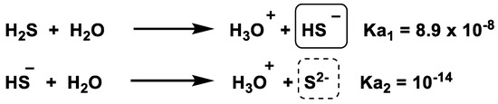 A sulfur atom is larger than an oxygen atom (covalent radius 105 vs. 66) and has a comparatively lower electronegativity value of 2.5 on the Pauling scale, while oxygen (O) has a higher electronegativity value of 3.5. In addition, sulfur is characterized by a higher degree of polarizability. Consequently, the dipole moment of H2S is comparatively smaller than that of water, being 0.97 D and 1.85 D, respectively, and intermolecular interactions are weaker. It has a similar structure to water, but since sulfur has lower electronegativity values than oxygen (S = 2.5 and O = 3.5, according to the Pauling scale), H2S is less polar than water [14]. Compared to water, this difference has an impact on the inability to form hydrogen bridges. H2S can diffuse freely through the hydrophobic core of biological membranes [15]. The sulfur in H2S has the electronic configuration 1s2, 2s2 2p6, 3s2 and 3p6 and borrows an electron from each hydrogen to complete its valence shell (Figure 2).