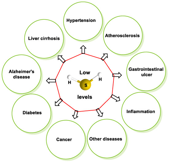 It is important to control the concentration of H2S in mammalian tissues, which is maintained at nanomolar levels [63]. The concentration of H2S varies between different tissues, and the general agreement is that its concentration should be present in nanomolar concentration, as higher concentrations can inhibit metal-containing proteins. However, methods for the detection of H2S are currently being developed.