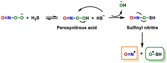 - Filipovic, M.R.; Miljkovic, J.; Allgäuer, A.; Chaurio, R.; Shubina, T.; Herrmann, M.; Ivanovic-Burmazovic, I. Biochemical insight into physiological effects of H2S: Reaction with peroxynitrite and formation of a new nitric oxide donor, sulfinyl nitrite. Biochem. J. 2012, 441, 609–621. [Google Scholar] [CrossRef]