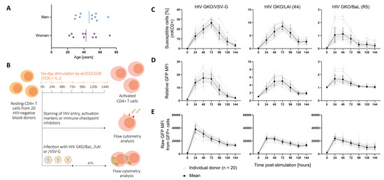 Cell permissiveness to HIV evolves with cell activation dynamics. (A) Panel of twenty HIV-negative blood donors included ten men and ten women of age ranging from 22 to 72 years. The vertical bar represents the mean age for men and women, respectively. (B) Resting CD4+ T cells from 20 HIV-negative blood donors were stimulated with αCD3/CD28 in presence of IL-2 over a 144 h period. After each 24 h period, the cells were collected and were either stained for cell surface proteins or infected with the HIV GKO dual-reporter vector. The activation state was tracked by measuring the cell surface protein’s expression of activation and ICIs, as well as HIV entry receptors, using fluorophore-conjugated antibody staining. Each staining was performed in duplicates and assessed using flow cytometry. In parallel, cells were infected with HIV GKO harboring distinct viral envelopes (VSV-G, X4-tropic LAI, R5-tropic BaL) in biological duplicates. Cell permissiveness to HIV was assessed 47 h p.-i. using flow cytometry. (C–E) Infection success over time p.-s. for the three HIV GKO vectors harboring distinctive envelopes (VSV-G, LAI, BaL). The grey lines represent the infection kinetics obtained for each individual donor and are the mean of the biological duplicates. The black line represents the mean of all the donors. The error bars represent the SD. (C) The proportion of cells susceptible to HIV infection was assessed with cells expressing EF1α-driven mKO2. (D) The global cell population permissiveness to HIV was assessed as a relative GFP MFI, normalized by the corresponding mock-infected control, informing the success of entry, integration, and productive LTR-driven GFP expression. (E) The intracellular permissiveness level was assessed by measuring the raw GFP MFI in GFP+ cells.