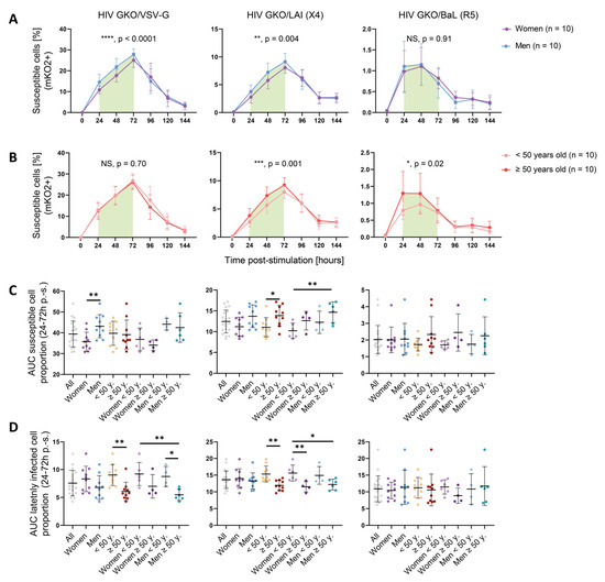 To study the impact of specific features such as sex and age on CD4+ T cell permissiveness to HIV, the data were further analyzed according to these parameters. A comparison of HIV infection kinetics between women and men cells revealed that infection kinetics were similar between both sexes, but that men harbored increased numbers of susceptible cells compared to women between 24 and 72 h p.-s., in the time window where cells had been previously identified as being most permissive (Figure 2A). This difference was significant for both the VSV-G- and LAI-mediated entries (HIV GKO/VSV-G ****, p < 0.0001; HIV GKO/LAI **, p = 0.004), but not for the BaL-mediated entry (p = 0.91), which may be the result of the low level of infection success. Permissiveness as reflected through GFP expression revealed increased levels in men cells and showed significance for VSV-G-mediated entry and a trend for LAI-mediated entry (HIV GKO/VSV-G, * p = 0.01; HIV GKO/LAI, p = 0.08; HIV GKO/BaL, p = 0.34) (Figure S4A). However, the intracellular GFP levels were similar between the sexes (HIV GKO/VSV-G, p = 0.74; HIV GKO/LAI, p = 0.43; HIV GKO/BaL, p = 0.44) (Figure S4B).