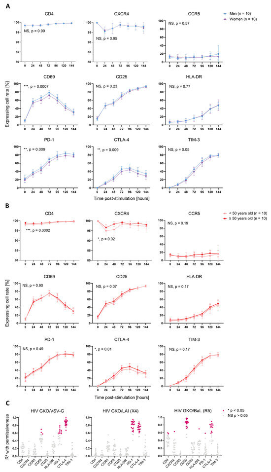 Activation-induced marker expression is biased by sex and age and correlates with cell permissiveness to HIV. (A,B) Proportion of cells expressing selected cell surface proteins over time p.-s. The proteins analyzed include HIV entry markers (CD4, CXCR4, and CCR54; upper graphs), activation markers (CD69, CD25, and HLA-DR; middle graphs), and ICIs (PD-1, CTLA-4, and TIM-3; lower graphs). The lines represent the mean of each category per time point. The error bars represent the SD. The statistical analysis between the donor groups was performed using two-way ANOVA. NS: not significant (p > 0.05). * p < 0.05, ** p < 0.01, *** p < 0.001. (A) Surface maker expression according to sex. Women are represented in purple and men in blue. (B) Surface marker expression according to age. The donors younger than 50 years old are represented in pale orange and the donors 50 years old or older in red. (C) Correlation analysis between protein surface expression (MFI of stained sample normalized to corresponding non-stained sample) and permissiveness to HIV (relative GFP MFI, normalized to corresponding mock-infected sample) for the three HIV GKO vectors throughout activation kinetics, as follows: (top) VSV-G; (middle) LAI (X4); and (bottom) BaL (R5). Each dot represents the R-square value calculated using linear regression for one donor with the mean of infection duplicates and the staining duplicates. Non-significant (NS) correlations (p > 0.05) are represented in grey and significant ones (*, p < 0.05) in pink.