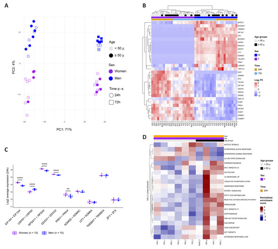 To further investigate and identify the cellular determinants responsible for donor-related permissiveness to HIV, we stimulated CD4+ T cells from each of the twenty donors for 24 or 72 h and performed bulk transcriptomic analyses. The principal component analysis (PCA) revealed that 71% of the variance between the samples was explained through activation, as expected, while 4% was attributed to sex (Figure 5A). Over a total of 13,154 detected genes, the differential gene expression analysis (DGEA) between men and women cells at 24 h p.-s. outlined 28 differentially expressed genes (DEG). The top DEG genes were mostly linked to X and Y chromosomes, with X-linked genes enriched in women and Y-linked genes enriched in men and absent in women, as expected (Figure 5B). To ensure a balanced biological function between the sexes, most X- and Y-linked genes unrelated to reproductive functions harbor a corresponding paralog on the other chromosome. As most of the DEG between men and women are linked to sex chromosomes, we interrogated the combined expression of corresponding paralogs in both sexes (Figure 5C). At 24 h p.-s., five out of the nine gene pairs presented a differential average expression in function of sex, with EIF1AY/EIF1AX (p = 1.4 × 10−10), RPS4Y1/RPS4X (p = 6.3 × 10−6), DDX3Y/DDX3X (p = 7.8 × 10−6), and PRKY/PRKX (p = 0.0065) enriched in women, while USP9Y/USP9X (p = 2.9 × 10−7) enriched in men. The translation of differential gene expression on functional pathway regulation was then assessed using a hallmark gene set enrichment analysis (GSEA). To further pinpoint how activation affects gene expression and functional pathway enrichment, the 72 h and 24 h stimulations were compared. The assessment of the stimulation effect outlined 5266 and 5220 DEG when comparing 72 h to 24 h stimulation in women and men, respectively (Figure S7A,B), and showed functional enrichment of pathways related to the cell cycle (e.g., E2F targets or G2M checkpoint) and metabolism (glycolysis, oxidative phosphorylation, or mTORC1 signaling), demonstrating the upregulation of genes linked to activation, together with a downregulation of innate immunity (Figure S7C,D). Similar results were obtained in men and women (Figure S7E). A further interrogation of all the donors by sex did not result in any significantly enriched pathway. As this may be the result of age-dependent variation, functional analyses of sex-induced effect were evaluated within age classes. Comparing the sexes within the <50 years and ≥50 years age categories did not result in any enrichment. As we reasoned that reproductive hormone status might influence the data, we further divided the donors into subcategories (i.e., 22–35, 36–52, and 53–72 years). Thus, we observed a variable effect only in the 36–52 years old donors, as it is probably in these donors that the most hormonal changes occur as it is the age group where women are most prone to enter menopause. The DGEA resulted in 156 genes, enriching pathways in men compared to women at 24 h p.-s. related to the activation or cell cycle as MYC targets, mTORC1 signaling, oxidative phosphorylation, glycolysis, or IL-2/STAT5 signaling, while IFN-α’s response was enriched in women (Figure S8A). These data suggest that activation is strengthened in men compared to women in age group 36–52 years.