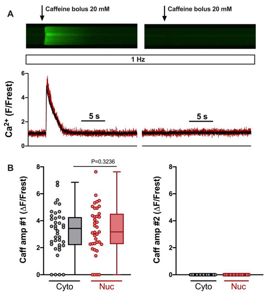 First, we established an experimental protocol for eliciting and quantifying SOCE in the cytosol and nucleus of adult cardiomyocytes. Figure 1A shows the protocol and Figure 1B the linescan images and corresponding normalized Fluo-4 (Ca) fluorescence traces of a ventricular myocyte at the times indicated (Figure 1B(a–j)). At the beginning (Figure 1B(a)), the myocyte was bathed in normal Tyrode’s (NT) solution and electrically stimulated (1 Hz). The resulting CaTs from cytosol (black) and nucleus (red) exhibited the characteristic pattern of a large and fast cytosolic CaT and a somewhat smaller, delayed nuclear CaT with a much slower decay [9]. These CaTs served for the later quantification of SOCE. Afterwards (Figure 1B(b)), stimulation was switched off and resting fluorescence (Frest) was recorded for the normalization of the fluorescence Ca signal. Stimulation was resumed (Figure 1B(c)) and CaTs reappeared. The solution was changed from NT to a zero-Ca solution containing thapsigargin, verapamil, and KB-R7943 to block SERCA, LTCC, and NCX, respectively. Under these conditions, CaTs were completely abolished (Figure 1B(d–f)). Two caffeine boli were applied (Figure 1B(g,h)) to probe for any remaining Ca in the SR. The first bolus (Figure 1B(g)) showed that the SR still contained Ca under these conditions. The second bolus (Figure 1B(h)) revealed that the SR was completely depleted of any Ca after the first bolus (see also Figure 2). Stimulation was switched off (Figure 1B(i)) and, finally, the cell was exposed to 2 mM Ca NT solution (Figure 1B(j)). This caused a slow but steady increase in cytosolic and nuclear Ca, which was taken as an indication of SOCE. The amplitude of this slow Ca increase at the end of the 90 s recording (Figure 1B(j)) served as a measure of SOCE. The exact fluorescence values used for the quantification of SOCE were taken from an additional linescan recording conducted a few seconds after the 90 s recording shown here (as detailed in Supplementary Figure S1). The protocol for eliciting SOCE as shown in this figure and Supplementary Figure S1 was used in the entire study.