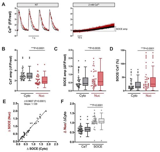 Robust SOCE in cytoplasm and nucleus of ventricular cardiomyocytes. (A) Representative normalized fluorescence traces of CaTs at 1 Hz stimulation (left) and SOCE evoked by re-addition of 2 mM Ca (right) of a ventricular myocyte. Cytosolic (black) and nuclear (red) traces are shown. (B) Averaged values of CaT amplitudes (ΔF/Frest). (C) Averaged values of SOCE amplitudes (ΔF/Frest). (D) SOCE amplitudes in the cytoplasm and nucleus normalized to the respective CaT in the very same cell. Cytosolic (Cyto, grey) and nuclear (Nuc, red) data is shown. (E) Linear correlation of nuclear and cytosolic SOCE amplitudes (Spearman correlation). (F) Average values of nuclear/cytosolic ratios of CaT amplitudes (black) or SOCE amplitudes (grey). Wilcoxon/Mann–Whitney test; p-values as indicated; **, p < 0.01; ***, p < 0.001; n = 39 cells from N = 16 rats.