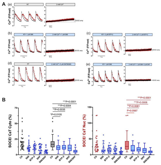 SOCE in atrial myocytes is reduced by pharmacological inhibitors of TRPC and Orai channels. (A) Representative normalized fluorescence traces of CaTs at 0.5 Hz stimulation (left) and normalized fluorescence traces of SOCE (right) of an untreated control atrial myocyte in the presence of DMSO (a) and of atrial myocytes measured in the presence of 1 μM S66 (b), 3 μM BTP-2 (c), 5 μM SKF96365 (d), or 1 μM S66 plus 5 μM SKF96365 (e). Cytosolic (black) and nuclear (red) traces are shown. (B) Averaged values of SOCE/CaT (%) for cytoplasm (left) and nucleus (right) of untreated control cells (ctl) and of cells treated with the various inhibitors, as indicated, depicted as scatter dot plots and box plots with medians. Kruskal–Wallis test with Dunn’s multiple comparisons test; DMSO ctl: n = 41, N = 17; S66: n = 27, N = 5; BTP-2: n = 29, N = 4; SKF: n = 32, N = 4; S66/SKF: n = 28, N = 7; p-values as indicated; ***, p < 0.001.
