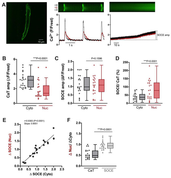 Atrial myocytes exhibit some distinct differences compared with ventricular myocytes with regard to morphology and function, including excitation–contraction coupling [33]. Hence, we also characterized SOCE in the cytosol and nucleus of atrial myocytes. To this end, we used the same experimental protocol as for ventricular myocytes (compare Figure 1). As shown in Figure 6A, atrial myocytes did not display a regular T-tubular system (left), but rather large electrically stimulated cytosolic and nuclear CaTs (middle) as well as readily detectable SOCE in the cytosol and nucleus (right). The CaT amplitudes amounted to ≈3.2 ΔF/Frest in the cytosol and to ≈1.4 ΔF/Frest in the nucleus (Figure 6B). The SOCE amplitudes, on the other hand, did not differ between cytosol and nucleus amounting to ≈1.0–1.1 ΔF/Frest in both compartments (Figure 6C). The relative SOCE amplitudes (normalized to CaT amplitudes) were larger in the nucleus (Figure 6D). There was a direct linear correlation between the SOCE amplitudes in the cytosol and the nucleus (Figure 6E). Finally, the ratio of the nuclear to cytosolic amplitude amounted to ≈0.5 for the electrically stimulated CaT and to ≈1 for SOCE (Figure 6F). These properties of cytosolic and nuclear SOCE in atrial myocytes were very similar to the ones in ventricular myocytes (compare Figure 3). A notable difference was that SOCE (in the cytosol and nucleus) was greater in atrial than in ventricular myocytes, both in absolute (ΔF/Frest) as well as relative (SOCE/CaT) terms (compare Figure 3C,D).