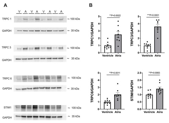 3.7. Expression of TRPC Proteins and STIM1 Is Higher in Atrial Myocardium
