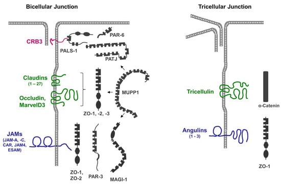 - Hartmann, C.; Schwietzer, Y.A.; Otani, T.; Furuse, M.; Ebnet, K. Physiological functions of junctional adhesion molecules (JAMs) in tight junctions. Biochim. Biophys. Acta Biomembr. 2020, 1862, 183299. [Google Scholar] [CrossRef]