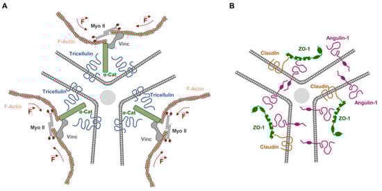 The development of barrier-forming epithelial monolayers requires the formation of a continuous TJ strand network that seals the entire epithelium. The sealing of cell vertices, the common points of three or more neighboring cells, creates a challenge to this requirement. Early studies using freeze-fracture EM showed that, at the sites of tTJs, the paired strands of two neighboring cells develop vertical extensions, so-called central sealing elements, which are cross-bridged with the central sealing elements of the two other bicellular contact sites to form a central tube [,]. Tricellulin has been identified as a structural and functional component of tTJs [] (Figure 2). Tricellulin is enriched at tTJs, and its depletion results in discontinuities of the TJ strand network along bicellular TJs (bTJs) and in a loss of the epithelial barrier function [], strongly suggesting that tricellulin links the bTJ strand network to the tTJs to warrant continuity of the network at the interfaces of bTJs and tTJs. While this model could not explain how cells prevent the leakage of solutes through the central tube that is lined by the three central sealing elements in the center of a tTJ (Figure 2), new evidence provides a possible explanation. Tricellulin is linked to the actomyosin network via α-catenin and vinculin [], two adapter proteins known to link cadherins to the actin cytoskeleton at AJs. Through its interaction with α-catenin and vinculin, tricellulin recruits actin filaments to the central sealing elements present at the tTJs. The myosin II motor-driven contraction of antiparallel actin filaments associated with tricellulin generates a close apposition of the central sealing elements originating from the three cells to minimize the intercellular space at tTJs [].
