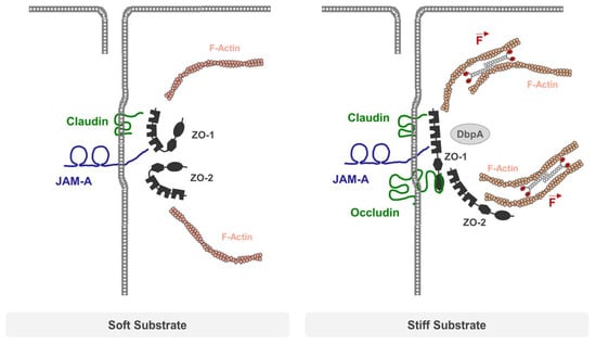 - Haas, A.J.; Zihni, C.; Ruppel, A.; Hartmann, C.; Ebnet, K.; Tada, M.; Balda, M.S.; Matter, K. Interplay between Extracellular Matrix Stiffness and JAM-A Regulates Mechanical Load on ZO-1 and Tight Junction Assembly. Cell Rep. 2020, 32, 107924. [Google Scholar] [CrossRef] [PubMed]