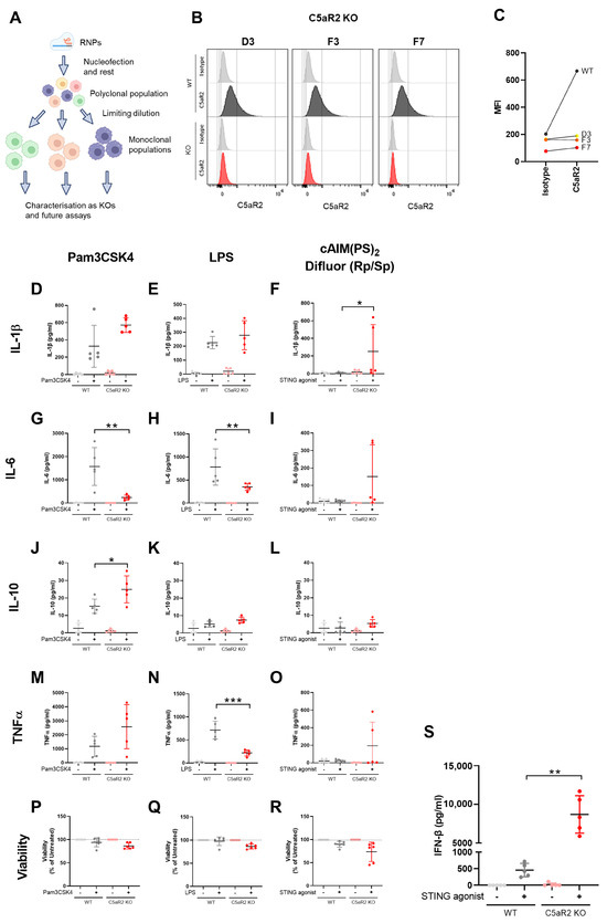 The role of C5aR2 in regulation of the innate immune response has been previously explored using C5a-based peptide agonists [14,16]. In this study, we assessed the relevance of C5aR2 in PRR signalling in a macrophage model. PMA-differentiated wild-type and C5aR2 KO THP-1 cells were stimulated with a range of PRR agonists, including TLR1/2 activation with Pam3CSK4, TLR4 activation with LPS and STING activation with cAIM(PS)2 Difluor (Rp/Sp). Downstream IL-1β (Figure 1D–F), IL-6 (Figure 1G–I), IL-10 (Figure 1J–L) and TNFα (Figure 1M–O) production was measured in supernatants, alongside cell viability (Figure 1P–R) and IFN-β production (Figure 1S). This initial screen was performed using a single clone of C5aR2 KO THP-1 cells (F7) with five technical replicates. C5aR2 KO caused a significant reduction in both Pam3CSK4 and LPS-induced IL-6 (Figure 1G,H), and LPS-induced TNFα (Figure 1N), and a significant yet variable increase in STING-induced IL-1β (Figure 1F). However, the most striking result from this screen was the enhanced IFN-β production in C5aR2 KO cells following STING agonism (Figure 1S), which warranted further investigation.