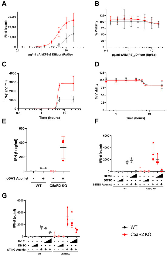 To further characterise the elevated IFN-β response observed in C5aR2 KO THP-1 cells upon STING agonism, the kinetics of IFN-β secretion in this context were assessed. These and all subsequent experiments were performed using three independent C5aR2 KO THP-1 cell line clones. The enhanced IFN-β response in C5aR2 KO cells was conserved between clones and correlated with increasing STING agonist concentration at a set time point of 6 h (Figure 2A). The time point of 6 h was selected to prevent the minor reduction in viability observed at 24 h post STING agonism (Figure 1R). At 6 h, only the top concentration of STING agonist showed a minor impact on viability (Figure 2B). C5aR2 KO THP-1 cells were then stimulated with 5 µg/mL STING agonist, selected to maximise the differential between wild-type and KO (Figure 2A) without impacting viability (Figure 2B), and IFN-β secretion was detected across a range of incubation times (Figure 2C). Compared to wild-type, C5aR2 KO THP-1 cells secreted higher levels of IFN-β at time points where IFN-β was detected (Figure 2C) and viability was retained until 24 h, where a small decrease was observed (Figure 2D). The enhanced IFN-β response was replicated with the cGAS agonist, G3-YSD (Figure 2E) and was blocked by antagonists of TBK1 (BX795; Figure 2F) and STING (H-151; Figure 2G). Taken together, these data indicate that C5aR2 KO markedly enhanced the IFN-β response to cGAS-STING pathway activation.