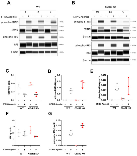 Given the enhanced IFN-β response to STING agonism in C5aR2 KO THP-1 cells, we investigated the expression of proteins in the cGAS-STING pathway. Wild-type and C5aR2 KO THP-1 cells were stimulated with 5 µg/mL STING agonist for 6 h, and expression of total and phosphorylated STING and IRF3, and loading control β-actin, was assessed by semi-quantitative capillary electrophoresis (Figure 3A,B). Peak area data for total STING (Figure 3C), activated STING (Figure 3D), phospho-STING (Ser366) (Figure 3E), total IRF3 (Figure 3F) and phospho-IRF3 (Ser386) (Figure 3G) were plotted as a ratio to β-actin to determine relative expression levels. C5aR2 KO THP-1 cells had a slightly increased level of activated STING compared to the wild-type control, and an increased level of phosphorylated IRF3, indicating that C5aR2 KO increases signal transduction downstream of STING activation.