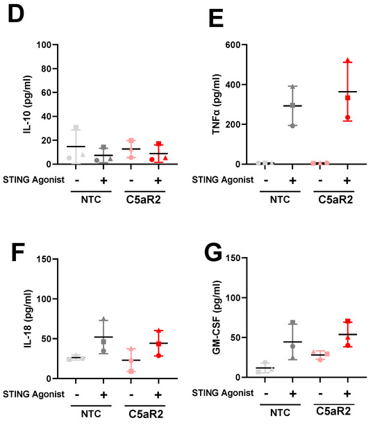The response to STING agonism described here is in concordance with the observations made by Li et al. [16]. C5aR2 KO amplified STING-induced IL-6 secretion, IFN-β secretion, and phosphorylation of STING and TBK1, suggesting that C5aR2 negatively regulates these pathways. The observation was corroborated using CRISPR-Cas9 editing of C5aR2 in primary hMDMs, which also resulted in enhanced IFN-β secretion upon STING agonism (Figure 4).