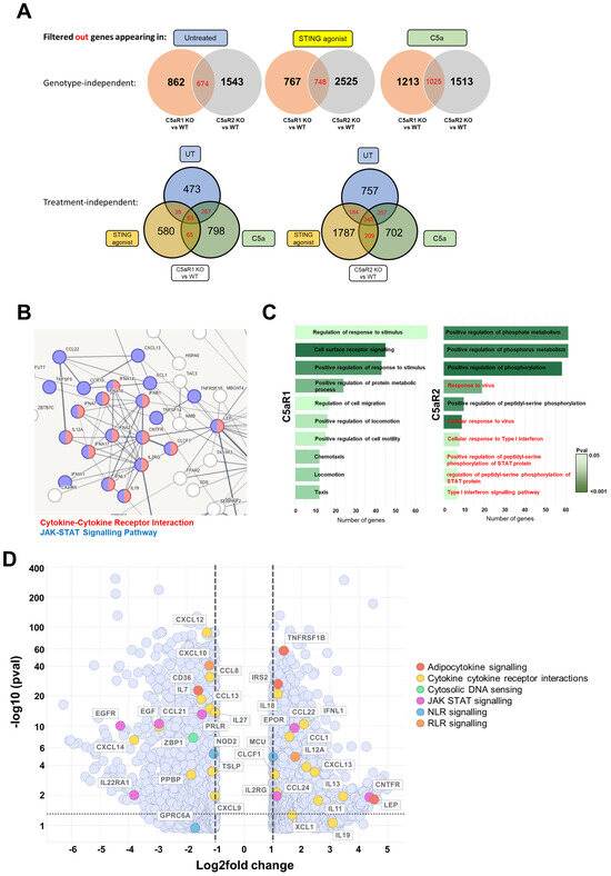 Pathway analysis of transcriptomic data reveals an enhanced antiviral phenotype in C5aR2 KO THP-1 cell lines compared to WT. (A) Unique, genotype-dependent, treatment-dependent significantly regulated genes (p ≤ 0.05, log2FC < ±1) were identified. (B) An unbiased cluster analysis and pathway analysis was performed using STRING, and the significantly enriched pathways were highlighted in red (Cytokine-Cytokine Receptor Interaction) or blue (JAK-STAT Signalling Pathway) (Supplementary Figures S6–S9). (C) An unbiased pathway analysis was performed using PANTHER and GO Biological Process gene sets. Red text highlights relevant anti-viral pathways (D) Significantly regulated KEGG gene sets from the GSEA were manually triaged, selecting for unique pathways for each condition, genotype-specific stimulation-independent pathways, or genotype-independent stimulation-independent pathways, filtering out stimulation-specific genotype-independent pathways, or pathways common to all conditions. Significantly regulated inflammatory pathways from the C5aR2 KO vs. wild-type comparison (C5a or STING agonist-treated) were manually curated. Selected genes from KEGG gene sets were marked in a volcano plot for STING agonist-treated C5aR2 KO cells vs. STING agonist-treated wild-type cells.