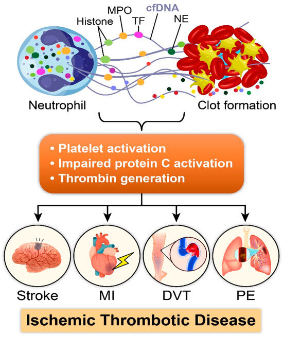 NETosis in ischemic thrombotic disease. The illustration depicts the critical role of NETosis in ischemic thrombotic disease. Neutrophil extracellular traps (NETs) released via NETosis contain DNA strands (cfDNA), histones, myeloperoxidase (MPO), tissue factors (TFs), and neutrophil-elastase (NE). NETs contribute to the formation and stabilization of thrombi via platelet activation, impaired protein C activation, and aberrant thrombin production, ultimately inducing stroke, myocardial infarction (MI), deep vein thrombosis (DVT), and pulmonary embolism (PE).