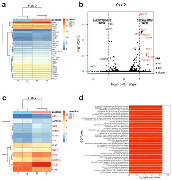 (a) A biclustering heatmap of the expression profile of the top 30 DEGs sorted by their adjusted p-value by plotting their log2 transformed expression values in four samples of the two conditions. (b) The volcano plot displays differentially expressed genes (DEGs) associated with DSG3. Here, the x axis represents the log2 fold change in each gene, while the y axis represents the log10 of its adjusted p-value. Each data point in the scatter plot represents a gene. Genes with an adjusted p-value less than 0.05 and a log2 fold change greater than 1 are marked as red dots, indicating upregulated genes. Blue dots represent downregulated genes, with an adjusted p-value less than 0.05 and a log2 fold change less than −1. The black dots represent the transcripts whose expression levels did not reach statistical significance between the two groups. (c) The biclustering heatmap of the expression profile of the 12 significant DEGs that are highlighted in B (also in Table S2). (d) Bar chart for the top 40 GO terms that are significantly enriched in biological processes with respect to the 12 significant DEGs based on the cutoff value. V: vector control group; D: Dsg3-overexpressing group.