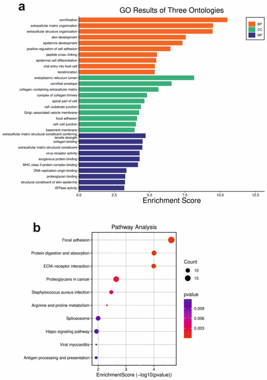 Gene ontology (GO) enrichment analysis of the DSG3 molecular network. (a) Bar chart for the significantly enriched gene ontology (GO) terms of differentially expressed genes (DEGs), with p-value < 0.05. BP: biological processes; CC: cellular components; MF: molecular function. The y axis shows GO terms, whereas the x axis denotes the enrichment score. (b) Bubble plot of pathway analysis. The size of each circle represents the number of genes. The colour scale indicates different thresholds of the p-value.