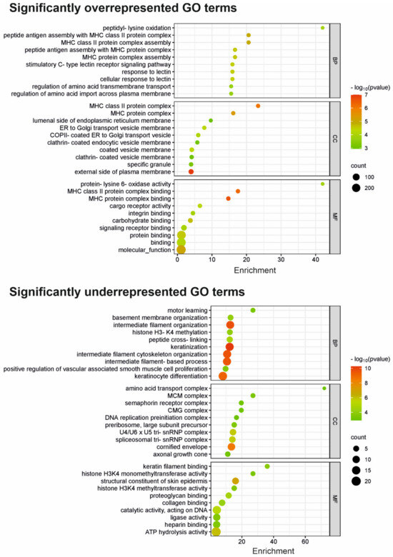 Gene ontology (GO) based on over- and underrepresentation analysis of the DSG3 molecular network. The bubble plots show overrepresentation analysis results (top panel) and underrepresentation analysis results (bottom panel) of the DSG3-associated genes. The y axis shows the top 10 significantly (p < 0.05) enriched GO terms, and the x axis displays the enrichment score. BP: biological processes; CC: cellular components; MF: molecular function. The colour scale indicates different thresholds of the p-value. The numbers of candidate genes annotated with a GO term are mapped to the scatter plot by point size.