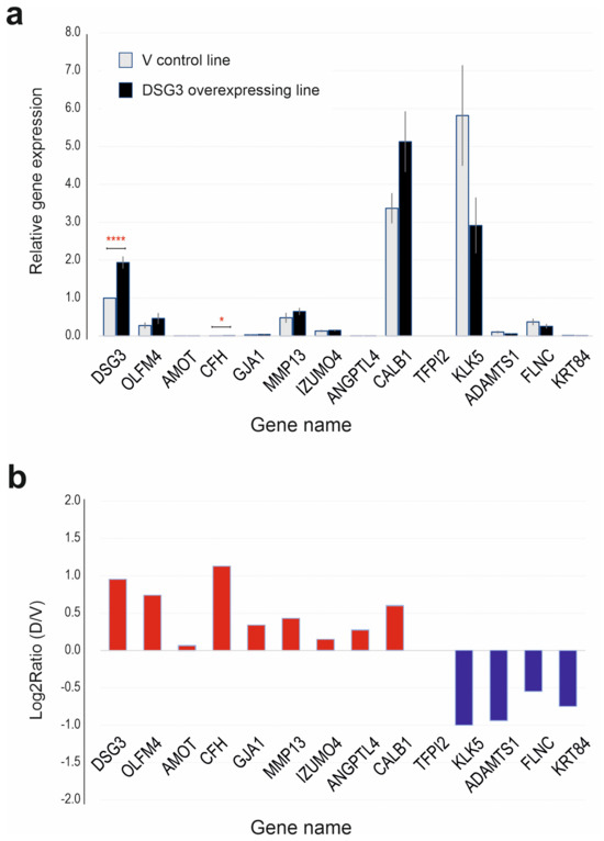 Validation of gene expression by RT-qPCR. (a) qPCR data indicating the relative gene expression (n = 6, pooled from three independent biological samples, mean ± SEM, * p < 0.05, **** p < 0.0001 determined by Student’s t-test). (b) Log2 ratio of D (DSG3-overexpressing) over V (vector) control samples. Except for TFPI2, which was undetectable, all other genes showed a similar trend to that of the RNA-Seq data (Figure 1).