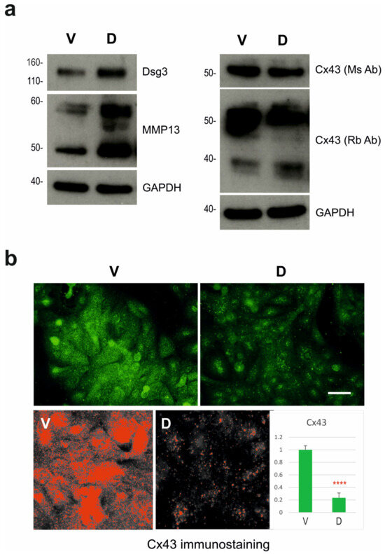 Validation of the protein expression for MMP-13 and connexin-43 (Cx43). (a) Western blotting analysis of the indicated proteins. GAPDH was used as a loading control. While MMP-13 showed an increase in the DSG3-overexpressing cells (D) compared to V (vector) control, Cx43 exhibited an opposite trend with a reduction in the D cell line. Two antibodies for Cx43 raised in two different species were tested here. (b) Cx43 immunostaining in V control and D cells (green). Below is the image quantitation highlighting the pixels above a threshold. The quantitation data are displayed in the bar chart on the right (mean ± SD, **** p < 0.0001).