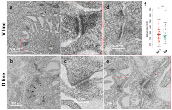 Transmission electron microscopy (TEM) of H413-D3 (DSG3-overexpressing) and H413-V control lines. Cells were grown to confluence for two days and then were treated with dispase (2.4 U/mL) for 20 min to detach the epithelial sheets. The samples were fixed immediately with glutaraldehyde overnight and stored in a fridge prior to TEM processing. (a–c) showed characteristic desmosomes with symmetrical electron-dense structures in both V control and D samples. However, those presented in D cells appeared slightly less electron-dense than those in V control cells. A cluster of desmosomes was captured in the D sample (black arrows). (d) displays two half-desmosomes presented only in one of the adjacent cells. (e) shows an immature desmosome adjacent to a short stretch of gap junction (red arrow). The enlarged images for the red dotted line boxes are displayed on the right. (f) shows a box whiskers plot of the desmosome size, which was measured in two conditions (V: n = 42; D: n = 37, Midline: median). No statistical significance (NS) was detected between them. Scale bars are 500 nm.