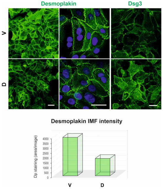 Confocal images for desmoplakin and DSG3 staining, respectively. Both proteins are predominantly distributed at the cell borders but with more enhanced and diffuse DSG3 cytoplasmic staining in D cells compared to V control. The quantitation data are shown underneath the images. Scale bars are 20 µm.