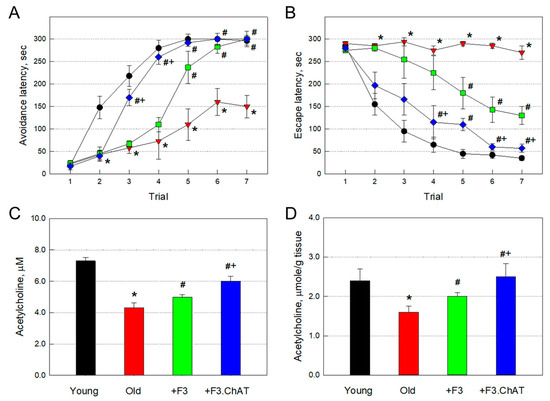 Passive avoidance (A) and Morris water maze (B) performances (n = 8–10/group) and acetylcholine levels (n = 10/group) in the brain (C) and muscles (D) at 21 months of age. Black: young animals (7 weeks old); red: aged animals; green: aged animals transplanted with F3 cells (1 × 106 cells every month); blue: aged animals transplanted with F3.ChAT cells (1 × 106 cells every month). * Significantly different from young animals (p < 0.05). # Significantly different from aged animals (p < 0.05). + Significantly different from F3 treatment (p < 0.05).