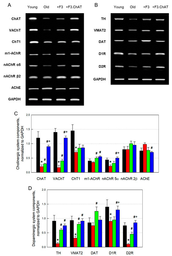 Restorations of cholinergic ((A,C), n = 8–10/group) and dopaminergic ((B,D), n = 8–10/group) nervous systems following F3 or F3.ChAT cell transplantation. RT-PCR (A,B) and quantitative analyses (C,D) of the mRNA expression of cholinergic and dopaminergic components. Black: young animals (7 weeks old); red: aged animals; green: aged animals transplanted with F3 cells (1 × 106 cells every month); blue: aged animals transplanted with F3.ChAT cells (1 × 106 cells every month). ChAT: choline acetyltransferase. VAChT: vesicular acetylcholine transporter. ChT1: choline transporter 1, m1-AChR: muscarinic 1 acetylcholine receptor. nAChR: nicotinic acetylcholine receptor. AChE: acetylcholinesterase. GAPDH: glyceraldehyde-3-phosphate dehydrogenase. TH: tyrosine hydroxylase, VMAT2: vesicular monoamine transporter 2. DAT: dopamine transporter, DR: dopamine receptor. * Significantly different from young rats (p < 0.05). # Significantly different from aged rats (p < 0.05). + Significantly different from F3 treatment (p < 0.05).