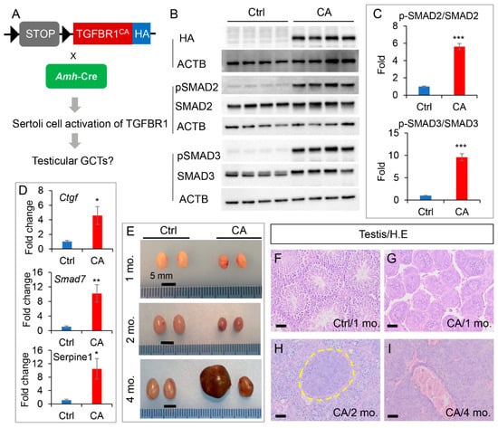 Development of testicular tumors induced by sustained activation of TGFBR1 in Sertoli cells. (A) A diagram depicting TGFBR1 overactivation using Cre-LoxP strategy. (B) Western blot analysis of TGFBR1CA expression and SMAD2/3 activation in TGFBR1CA; Amh-Cre testes from 1-month-old mice. n = 4. ACTB served as an internal control. (C) Quantification of Western blot results. As HA was only expressed in TGFBR1CA; Amh-Cre testes but not in control groups, quantification of HA was not performed. *** p < 0.001. (D) Upregulation of TGFβ targets in TGFBR1CA; Amh-Cre testes from 1-month-old mice. The blue bars represent control mice, while the red bars show TGFBR1CA; Amh-Cre mice (C,D). Data are Mean ± SEM. n = 6. * p < 0.05 and ** p < 0.01. (E) Gross images of testes from 1, 2, and 4-month-old control and TGFBR1CA; Amh-Cre mice. Scale bar = 5 mm. (F–I) H.E. staining of control and TGFBR1CA; Amh-Cre testes at the age of 1, 2, and 4 months. Independent samples from at least three mice per genotype were examined. Ctrl, control. CA, TGFBR1CA; Amh-Cre. Scale bar = 50 µm (F–I).