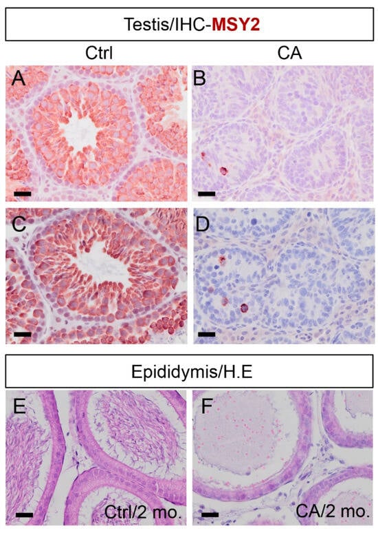 To ascertain whether germ cell loss contributed to the reduced testicular size during early tumor development, we performed an immunohistochemical analysis of Y box protein 2 (MSY2), a DNA/RNA-binding protein that is abundantly expressed in the germ cell [28]. We found drastically reduced immunoreactive signals for MSY2 in the testes of TGFBR1CA; Amh-Cre mice at both 1 and 2 months of age (Figure 2B,D) compared with the controls (Figure 2A,C), indicating a loss of germ cells during testicular tumor development. The finding was reinforced by the absence of sperm in the epididymis of TGFBR1CA; Amh-Cre mice (Figure 2F). In contrast, the epididymis of control mice contained abundant sperm (Figure 2E). Therefore, tumor development in TGFBR1CA; Amh-Cre mice derails spermatogenesis.