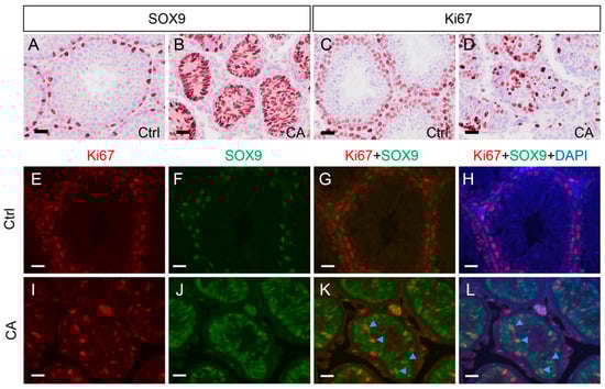 Increased Sertoli cell proliferation in testicular tumors of TGFBR1CA; Amh-Cre mice. (A–D) Immunostaining of SOX9 and Ki67 using testes from control and TGFBR1CA; Amh-Cre mice at 1 month of age. (E–L) Double immunofluorescence of Ki67 (red) and SOX9 (green) using testes from 1-month-old control and TGFBR1CA; Amh-Cre mice. Arrow heads in (K,L) show cells expressing both SOX9 and Ki67. DAPI staining (blue) shows the nuclei. Independent samples from at least three mice per genotype were examined. Scale bar = 25 µm (A–D) and 20 µm (E–L).