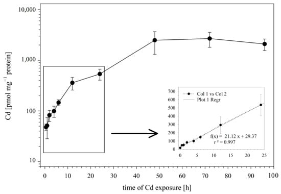 In the first set of experiments, we examined the influence of the incubation time on the Cd uptake by RTG-2 cells. To this end, the cells were incubated with 25 μM of Cd, and the Cd incorporation by the cells was analyzed after 0.5., 1, 2, 4, 6, 12, 24, 48, and 96 h of exposure. The time course of Cd uptake into the RTG-2 cells is shown in Figure 1. During the first 24 h of exposure, the Cd uptake followed a linear model, with an uptake rate constant of 21.12 pmol mg−1 protein h−1 (Figure 1 insert).