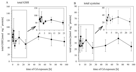 Time course of total GSH (A) and total cysteine (B) in RTG-2 cells exposed to 25 μM of CdCl2. Results represent mean values ± S.D. from two independent experiments with three to four replicates for each time point within each experiment. The time course during the first 24 h are enlarged in the insert. Cd did not exert significant effects on total GSH and total cysteine (p < 0.05).