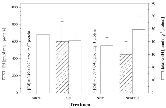 In the control cells, which were not exposed to NEM or Cd, only minute amounts of Cd (0.60 ± 0.35 pmol mg−1 protein) were detected after 24 h of incubation. When the cells were exposed to 25 μM of CdCl2 for 24 h, Cd accumulated in the cells, and the intracellular Cd levels reached a concentration of 601.2 ± 209.7 pmol mg−1 protein. The co-incubation of Cd with NEM reduced the level of intracellular Cd to 450.2 ± 138.2 pmol mg−1 protein (Figure 3), i.e., the cells co-treated with NEM and Cd accumulated only 75% of the Cd of the cells exposed to Cd alone. This reduction in Cd uptake, however, was not significant. In parallel to the measurement of cellular Cd levels, the same cells were also analyzed for the cellular concentrations of GSH. The results show that the intracellular Cd accumulation was not associated with a significant alteration in cellular GSH levels, neither in the cells exposed to Cd alone (40.7 ± 9.2 nmol GSH mg−1 protein) nor in the NEM-co-treated cells (49.5 ± 10.3 nmol GSH mg−1 protein) (Figure 3).