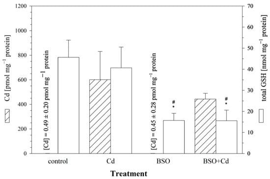 The effect of the γ-glutamylcysteine synthetase inhibitor BSO on cellular Cd and total GSH levels in RTG-2 cells. Control cells were maintained under standard conditions for 24 h. Cells were exposed to 25 μM of CdCl2 for 24 h without (Cd) and after 24 h pre-incubation with 1 mM of BSO (BSO + Cd). The left y-axis displays intracellular Cd contents (hatched bars), and the right y-axis displays intracellular GSH levels (open bars). Data represent mean values ± standard deviation of two independent experiments, with four replicates for each treatment group within each experiment. * indicates statistically significant different compared to the untreated RTG-2 cells (p < 0.05); # denotes statistical significant difference versus cells exposed to Cd alone (p < 0.05).